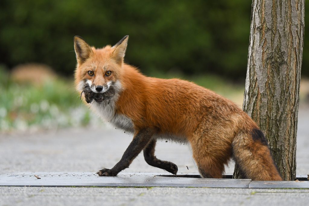 Dad Fox carrying two voles out of the amazingly open den site in Lurie Garden.